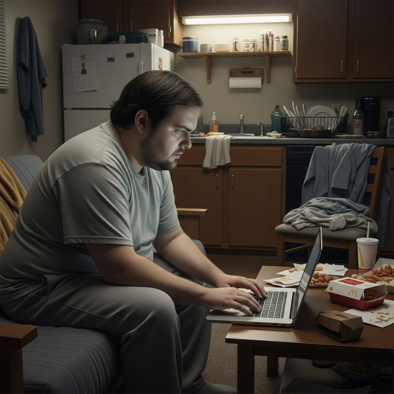 Sam looked around his studio apartment where he worked from home, sprawled on the couch. The dingy living space reflected his life philosophy perfectly. Dirty dishes stacked in the sink because running the dishwasher required loading it properly—and who had time for Tetris with plates? Laundry piled on the chair because the laundromat was six blocks away, which was basically a marathon in city terms. Fast food containers littered the coffee table because trash day meant actually taking the bag downstairs.