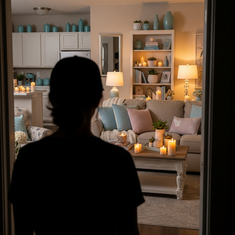 Gone was the bachelor pad disaster zone he'd abandoned that morning. In its place was something that looked like it had been designed by someone who unironically used words like "curated lifestyle." Soft throw pillows in pastel colors adorned a spotless couch that was decidedly not the generic futon he remembered owning. Candles flickered on every surface, filling the air with lavender and vanilla—scents that suggested someone had strong opinions about aromatherapy.